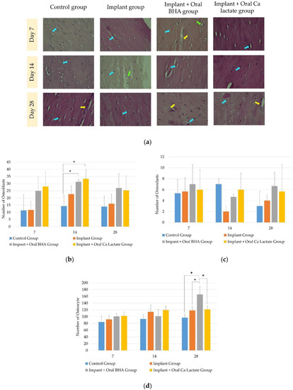 The data from the observation of osteocyte cells (Figure 3a) obtained data that were normally distributed (p > 0.05) and homogeneous (p > 0.05) for each termination period. On days 7 and 14 there was no significant difference (one-way ANOVA; p > 0.05) between groups. Meanwhile, on day 28, it was found that the implant + oral BHA group was significantly different from the defect group (control), the implant group and the implant + oral calcium lactate group (one-way ANOVA post hoc LSD; p < 0.05). This indicates the effect of the addition of oral BHA on the number of osteocyte cells (Figure 3d).