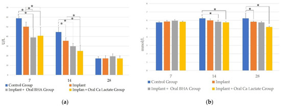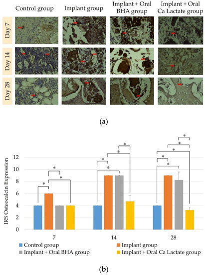 Immuno-histochemical examination with anti-osteocalcin was performed to determine the number of osteoblasts which are markers of mineral deposition and growth of mature callus in each treatment group. The results of observations of osteocalcin expression in the negative control group, implant group, implant + oral BHA group, and implant + oral calcium lactate group at 7, 14, and 28 days (Figure 5b) showed differences in the value of osteocalcin expression (p < 0.05) with the Kruskal–Wallis test. On days 14 and 28, the implant + oral BHA group showed higher IRS scores than the implant + calcium lactate group (Mann–Whitney; p < 0.05).