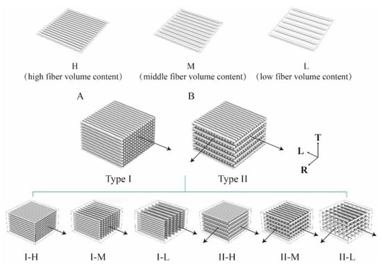 Experimental laminated structure: (A) type I: parallel lamination with varying fiber volume; (B) type II: cross lamination with varying fiber volume. Arrows indicate the direction of grain in the veneer layers; T, thickness; L, length; and R, width. I-H, parallel lamination with high fiber volume content composites; I-M, parallel lamination with middle fiber volume content composites; I-I, parallel lamination with low fiber volume content composites; II-H, cross lamination with high fiber volume content composites; II-M, cross lamination with middle fiber volume content composites; II-I, cross lamination with low fiber volume content composites.