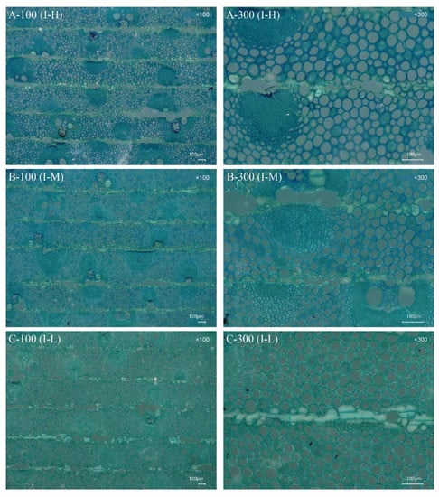 Photomicrographs of transverse sections of bamboo laminated composites of parallel lamination (type I). Resin penetration status of composites with varying fiber volumes. (A–C) denote types with high (I-H), medium (I-M), and low (I-L) fiber volumes, respectively; ×100 and ×300 represent magnifications; scale bar = 100 μm. A-100, parallel lamination with high fiber volume content composites at ×100 represent magnifications; A-300, parallel lamination with high fiber volume content composites at ×300 represent magnifications; B-100, parallel lamination with middle fiber volume content composites at ×100 represent magnifications; B-300, parallel lamination with high fiber volume content composites at ×300 represent magnifications; C-100, parallel lamination with low fiber volume content composites at ×100 represent magnifications; C-300, parallel lamination with low fiber volume content composites at ×300 represent magnifications.