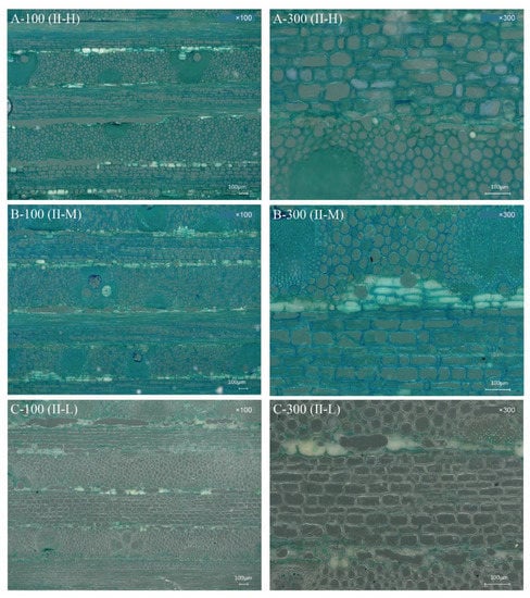 Regarding the microstructures of BLCs, compared with type I-H (Figure 2A), more resin penetrated the parenchyma and intercellular layers of I-M (Figure 2B), resulting in a slight difference in TS between types I-H and I-M. For type II (Figure 6B), the TS of II-M was greater than that of types II-H and II-L, but the differences were not significant.