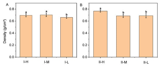 The average density of the samples is shown in Figure 4 and ranged from 0.66 (I-L) to 0.77 g/cm3 (II-H). For type I, the densities of I-H and I-M were not significantly different but were both higher than that of I-L. Density determines the mechanical properties of bamboo to a great extent and mainly depends on the fiber content, fiber diameter, and cell wall thickness. The density of bamboo increased with the increase in fiber content. Bamboo fiber volume fractions decrease along the radial direction from the outer to the inner layer of the culm wall [], resulting in bamboo layers of varying densities. This difference was improved by resin impregnation and hot pressing, as the densities of types I-H and I-M demonstrated no significant difference. Among the type II BLCs, the density of type II-H was higher than those of II-M and II-L, with no significant density difference between types II-M and II-L.