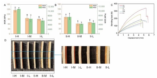 The results obtained from the sample bending tests are shown in Figure 5, with a MOR ranging from 61.68 (II-M) to 145.1 MPa (I-H) and an MOE from 4.33 (II-M) to 10.97 GPa (I-H). Figure 5A,B shows that in both types I and II, the MOR of high fiber volume BLC was significantly greater than that of middle and low fiber volume BLC, whereas the MOR did not vary significantly between the middle and low fiber volume BLC.