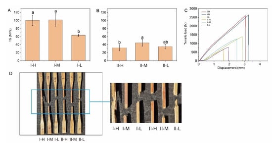 The tensile test results are shown in Figure 6, with TS ranging from 32.54 (II-H) to 101.53 MPa (I-M). In type I, the TS of I-M and I-H was significantly higher than that of I-L, and there was no significant difference between types I-M and I-H (Figure 6A). The degree of bonding strength with resin varied because of the different fiber volumes (Figure 2). The bamboo culm has a unique, heterogeneous structure that lacks horizontal ray cells, while pits act as the only transverse conduits in the internode []. For a lower fiber volume, as per the mechanical interlocking theory, the resin was likely to infiltrate the voids and form spiky structures on the transverse conduits.
