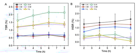 Figure 7 shows the TSR and WSR of the BLCs after an 8 h water treatment. The final TSR ranged from 0.56 (I-M) to 2.14% (II-H), and the final WSR ranged from 0.07 (II-L) to 1.61% (I-H). For type I, a slight difference was found between the TSR of the three samples. However, for type II, the TSR of II-H was significantly higher than that of types II-M and II-L, but the difference between II-M and II-L was not significant. This might be caused by the conspicuous lack of resin at the bondline of II-H (Figure 3A), as the weak bond strength resulted in decreased water resistance.