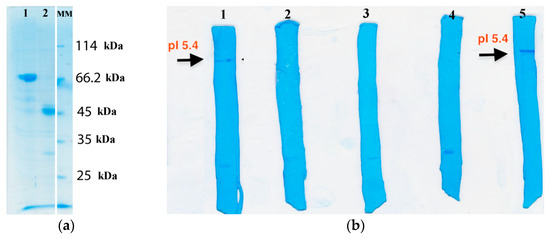 (a) SDS-PAGE electrophoresis of: 1—commercial HRP before purification; 2—HRP-C isoform; MM—Molecular weight markers. (b) Isoelectric focusing and pI values of HRP isoforms: 1—commercial HRP before purification; 2–4—basic isoforms; 5—HRP-C isoform.
