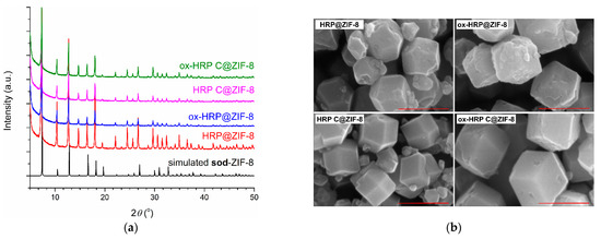 For the optimization of reaction time, biomineralization experiments (room temperature in distilled water) with HRP were performed with mixing times of 30 min, 1 h, 2 h, 4 h, 6 h, and 12 h, followed by agitation for 1 h. In all these experiments, the final enzyme concentration was 0.5 mg/mL, while the final concentrations of Zn(II) ions and HmIM were 0.02 M and 1.0 M, respectively. These precursor concentrations/mole ratios are prerequisites for the synthesis of phase pure biocomposites with preferred sod-ZIF-8 topology [22]. The precipitates were washed with distilled water, air dried, and further examined by PXRD. Obtained PXRD patterns were compared to the simulated ones for sod-ZIF-8 (Figure A2, Appendix A). It was confirmed that in all reactions biocomposites with sod ZIF-8 topology were obtained. For further experiments, a reaction time of 30 min was chosen. Figure 3a shows PXRD patterns of the precipitates obtained using HRP, ox-HRP, HRP-C, and ox-HRP-C, while SEM images (Figure 3b) confirmed that standard rhombic dodecahedral microcrystalline biocomposites, exhibiting average crystallite diameters of 400–550 nm, were obtained. From SEM images of bulk samples (Figure A3, Appendix A), the following size distribution of biocomposites was measured: 392 ± 37 nm (HRP@ZIF-8), 399 ± 41 nm (HRP-C@ZIF-8), 546 ± 54 nm (ox-HRP@ZIF-8), and 543 ± 71 nm (ox-HRP-C@ZIF-8).