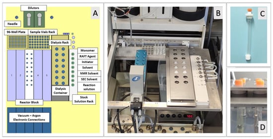 A commercially available automated parallel synthesizer (APS) (Chemspeed ASW 2000, Fuellinsdorf, Switzerland) was used to implement the proposed APD method. The ASW2000 APS is equipped with a robotic arm bearing a needle head (NH) connected to tubing and to two dilutor pumps for handling liquids automatically, interchangeable reactor blocks, 96-well plate racks, sample vial racks, and a stock solution rack. The reactor blocks can consist of sixteen or four glass reaction vessels (13 mL or 75 mL, respectively) with thermal jackets connected in series to a heating/cooling system (from −20 to 140 °C, Huber Ministat CC 3, Baden-Wurttemberg, Germany), and a vortex mixer (up to 1400 rpm). Additionally, each reaction vessel is equipped with a cold-finger reflux condenser (5 °C). The automated liquid handling system is used for dispensing reagents and sampling into/from the reactor vessels and/or sample vials. The NH is connected to a solvent reservoir bottle for needle rinsing after each liquid transfer. Further details about the characteristics and capabilities of the Chemspeed ASW 2000 platform can be found elsewhere [,,]. For the proposed APD method (Figure 2), a custom-made rack (Figure 2D) was employed to house the utilized and commercially available Float-A-Lyzer®® G2 dialysis tubes (Figure 2C). The rack containing the dialysis tubes was placed between a reactor block and the stock solution rack on the deck of the APS, as depicted in Figure 2A,B. Utilizing the software of APS, multiple parallel synthesis and/or parallel dialysis can be programmed and executed in an unattended fashion. Sample dilutions and/or transfers of polymerization mixtures, for instance, from the reaction vessels into the dialysis tubes, can be automatically performed with the aid of the liquid handling system of the robotic platform. It is also possible to automatically and periodically monitor the progress of the performed chemical reaction and/or dialysis purifications at different time intervals by withdrawing aliquots from the reaction vessels and/or dialysis tubes followed by suitable analyses (e.g., 1H-NMR or SEC measurements); the sample preparation for such an analysis can also be performed in an unattended fashion [,,].