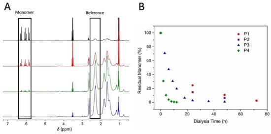 (A) 1H NMR spectra in D2O with a water suppression function for polymer P4 at different times to monitor the dialysis process. (B) Residual monomer vs. dialysis time for aqueous solutions of polymers P1–P4.