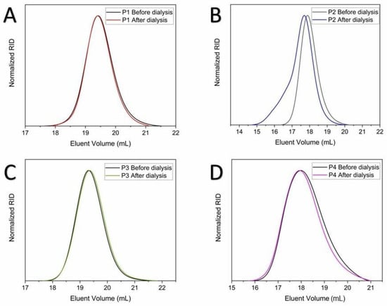 As shown in Table 2, the Mn and Đ values of polymers P1-P4 were determined by SEC analyses before and after the application of the APD method. For polymers P1, P3, and P4, no significant changes were observed in the Mn and Đ values (Table 2) and for the corresponding molar mass distributions (SEC traces displayed in Figure 4). In contrast, a noticeable increase in the Mn and Đ values (Table 2) and modification of the molar mass distribution towards higher molar mass values (Figure 4) were observed for polymer P2. This observation may be ascribed to the rise of possible interactions between P(GMMA) polymer chains via hydrogen bonding during the dialysis process, as suggested elsewhere [], which may promote the formation of polymer species of different molar mass and, therefore, the modification of the hydrodynamic volume of such polymer chains during the respective SEC analyses. This behavior can also be related to the presence of water traces (in our case, most likely derived from the dialysis process), which may remain in the respective polymer samples, as suggested elsewhere [,].