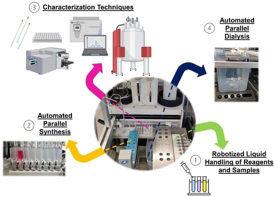 However, the rapid and effective purification of polymer libraries obtained from HT/O synthesis still remains an unsolved experimental task, which is labor-intensive and time-consuming, without mentioning the very often overlooked lack of repeatability and reproducibility of the obtained purified polymers []. This aspect actually represents a significant constraint for polymer-related R&D workflows. For instance, recent contributions using HT/O experimentation to screen generated polymer libraries still suffered from this unsolved drawback as the purification of the materials is still manually performed using a one-at-a-time approach [] or overlooked []. In certain R&D projects, this drawback could lead to inconclusive ambiguous results due to the evaluations of poorly reproducible or impure polymer candidates.