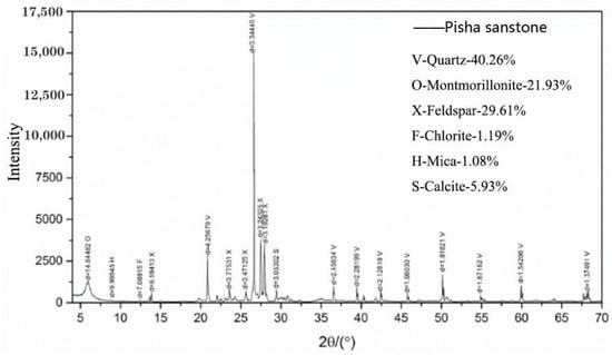 The Pisha sandstone samples were taken from the Erhuogou basin in the Huafuchuan basin (Ordos City, China), a primary tributary of the Yellow River, where the Pisha sandstone is mainly greyish-white, loose in structure, and severely fractured by water, and is generally a more severely weathered Pisha sandstone. In order to obtain the mineral composition of the Pisha sandstone sample, an XRD (Bruker, Bremen, Germany) test was carried out on the Pisha sandstone sample. Firstly, the sample was oven dried at 105 °C for 24 h; then, the dried sample was ground to obtain the powdered sample with a particle size of fewer than 80 μm. Afterward, the sample was scanned using a D8-Discover X-ray diffractometer, for which the detector type was LynxEte, and its X-ray diffraction pattern was obtained. The test was set to a two-theta range of 0–90°, with a step width of 0.02° and a scanning speed of 0.15 s/step. Finally, in combination with the X-ray diffraction pattern, the standard powder diffraction data for the various substances provided by the Powder Diffraction Consortium International Data Centre (JCPDS-IC-DD) were used for comparative analysis. Then, the mineral composition of the Pisha sandstone sample was determined, and the relative content of each phase was also quantified. The test results are shown in Figure 1. It was found that the sample contains 40.26% quartz, followed by 29.61% feldspar, 21.93% montmorillonite, and 5.93% calcite, with small amounts of chlorite and mica at 1.19% and 1.08%, respectively.