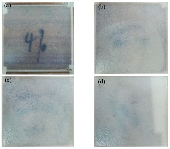 W-OH solid consolidations with different concentrations: (a) W-OH concentration: 4%; (b) W-OH concentration: 6%; (c) W-OH concentration: 8%; and (d) W-OH concentration: 10%.
