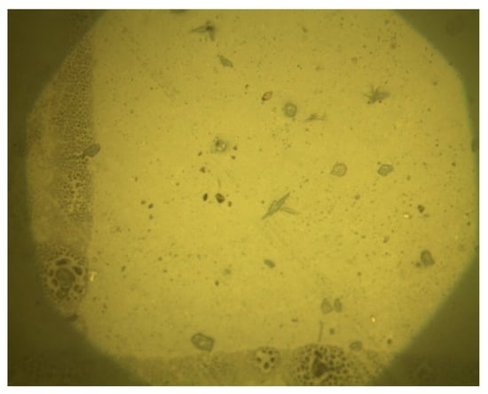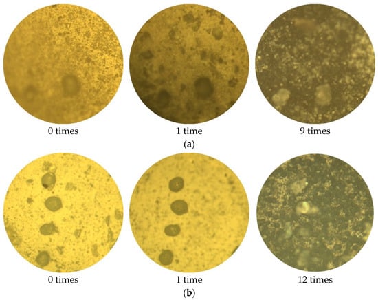 In this experiment, the Olympus metallographic microscope (Shanghai Puhe Photoelectric Technology Co., Ltd., Shanghai, China) was used to observe the solid consolidation after the dry–wet cycles of W-OH using concentrations of 4%, 6%, 8%, and 10%, respectively. The method of the in-situ observation is as follows: firstly, the solid consolidation is cut to a size of about 2 cm, and a cross is drawn on it with a marker pen, with the numbers 1, 2, 3, and 4 written onto the four quadrants formed by the cross; finally, place it on a glass slide and observe the four positions of the cross through a microscope, as is shown in Figure 4.