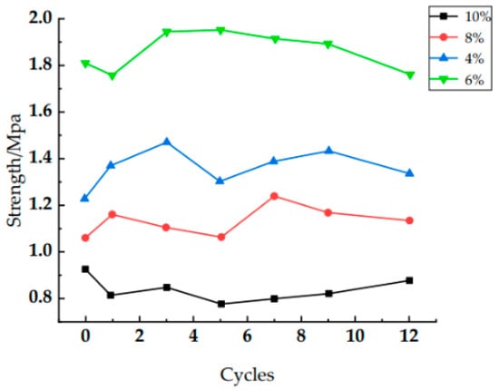 Figure 5 shows the localization shift strength for each concentration (4%, 6%, 8%, and 10%). It can be found that the localization shift strength of the solid consolidations for each concentration fluctuates roughly within a range during the dry–wet cycles. This is because the effect of water on the solid consolidations during water immersion is mainly plasticizing. Water molecules enter into the macromolecular chain to form hydrogen bonds with the polar groups of polymer molecules, making the intermolecular forces in the polymer chain weaken, with the mechanical properties reduced. However, the process is reversible and can be restored to its original properties through the drying process of dehydration. In addition, since the solid consolidation is polyether-type polyurethane, the hydrolysis is very weak, so the dry–wet effect has little effect on it. The localization shift strength at this moment mainly depends on the pores and the number of molecules per unit volume of the solid consolidation. The smaller the pores, the more molecules per unit volume, and the greater the strength. At concentrations of 4 and 6%, the number of molecules per unit volume has a greater effect on the strength of the solid consolidation compared to the pores because there are fewer pores inside the solids. As the concentration increases, the number of molecules per unit volume of the solid consolidation increases, so the strength of the solid consolidation at a concentration of 6% is greater than that of 4%. At concentrations of 8 and 10%, the pores have a greater effect on the strength of the solid consolidation compared to the number of molecules per unit volume because there are more pores inside the solid consolidation; so much so that the strength of the 8% concentration solid consolidation is even lower than that of the 4% concentration solid consolidation. As the concentration increases, the pores of the solid consolidation increase. Therefore, the strength of the solid consolidation at 8% is greater than that of 10%. The average values of the localization shift strength for each dry–wet cycle (of 4%, 6%, 8%, and 10% concentrations) were 1.397, 1.945, 1.167, and 0.848 MPa, respectively. The fluctuation of the localization shift strength during the whole dry–wet cycle is due to a fluctuation in the pores inside the solid consolidations. However, the same concentration of solid consolidations with porosity (in a range) makes the localization shift strength fluctuate in a range. Therefore, the mechanical properties of the solid consolidations are not weakened by the dry–wet cycles, and the W-OH solid consolidations have excellent resistance to dry–wet cycles at all concentrations.