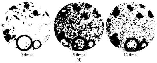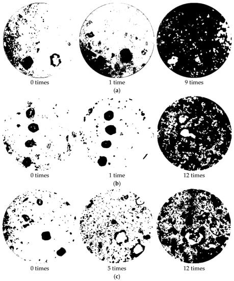 To quantify the surface morphological changes and the development of dark spots on the W-OH solid consolidations at different concentrations for each number of dry–wet cycles, the same area of the image shown above is binarized, as shown in Figure 7. Binarization involves setting the grey scale values of the pixel points in the image to 0 or 255 so that the whole image appears only distinctly black and white. Almost all of the current optical observations are made by the scanning electron microscope (SEM). However, in this paper, for the observations of the changes in the surface morphology of the solid consolidations, accurate results could be obtained just by using the binarization process. Dark areas are shown as black with an area of SB, and nondark areas are shown as white with an area of SW. The change in surface morphology is indicated by the dark spot rate, k, which is shown in Equation (12).