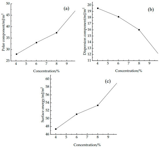 The left and right contact angles at 10 s, 30 s, and 60 s were obtained using analysis software. A total of five different locations were selected for each liquid on the surface of the W-OH solid consolidation, and the final average value was taken as the result. That is, the final contact angle was taken as the average of the 30 contact angle values. The surface energy parameters of the W-OH solid consolidation for each concentration were obtained by substituting the contact angle data and the surface free energy parameters of the test liquid into Equation (5). The relationship curves between the surface energy parameters and W-OH concentrations are shown in Figure 8. It was found that, as the concentration increases, the polar component of the solid consolidation at each concentration increases. This is mainly because the increase in concentration contributes to the generation of polar chemical bonds, such as carbamate and urea bonds, which leads to an increase in the intermolecular hydrogen-bonding forces, increasing the polar fraction [,]. While the dispersion component decreases with increasing concentration, the final surface energy increases with increasing concentration because the increase in the polar component is greater than the decrease in the dispersion component. It can be seen that the contribution of the polar component plays a major role in the surface energy of the W-OH solid consolidation compared to the dispersion component.