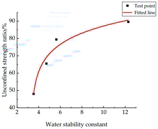According to the previous analysis, it is found that the greater the energy change during the adhesion process of W-OH (forming a two-phase system with the Pisha sandstone), the higher the strength of the solid consolidation. The greater the energy change in the exfoliation process (W-OH–Pisha sandstone system is transformed into the W-OH-water system and the Pisah sandstone-water system), the less W-OH is replaced by water and is exfoliated, with the strength of the solid consolidation reduced during the dry–wet cycles. Therefore, the strength of the solid consolidation is influenced by the adhesion and exfoliation processes. The correlation between the water stability constant and the unconfined strength ratio is now analyzed; the results are shown in Figure 9.