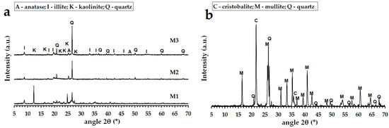 XRD patterns of the aluminosilicate raw materials (a) and chamotte (b).