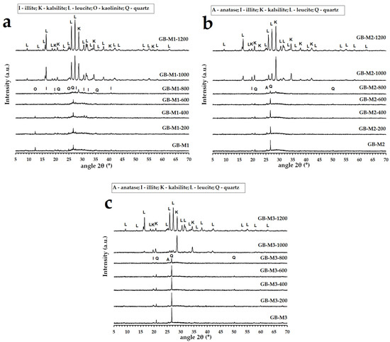 XRD patterns of the geopolymer binders with different type of aluminosilicate ((a)—GB-M1, (b)—GB-M2, (c)—GB-M3) at laboratory temperature and after exposure up to 1200 °C.
