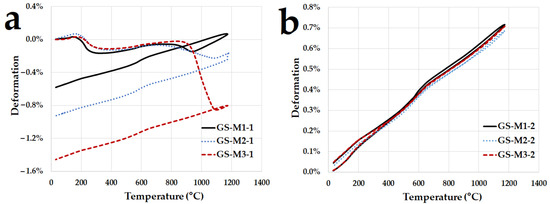 Figure 6a shows the curves of thermal dilatometry (first run) of the geopolymer composites with three different types of aluminosilicates measured from temperature 30 °C to 1200 °C at a heating speed of 5 °C/min. The dilatometric curves demonstrated that the effect of the aluminosilicate used was noticeable only from a temperature of 900 °C. As has been previously observed [54,55], the geopolymer shows slight shrinkage between approximately 100 and 300 °C, ascribed to the water loss from the geopolymer matrix. In the temperature range from 300 to 900 °C, a slight expansion was observed for all geopolymer composites due to the compensation of the shrinkage of the geopolymer matrix caused by the dehydroxylation and expansion of the filler. Interestingly, the shrinkage of the geopolymer samples at approximately 900 °C tends to accelerate, which was called viscous sintering [10,56]. The shrinkage was caused by the formation of new phases of kalsilite and leucite. Geopolymer composites experienced slight expansions up to the temperature limit of the experiment (1200 °C) from a temperature of 1100 °C (in the case of the GS-M1 sample, from 950 °C). The samples with calcined kaolinitic claystones (GS-M2 and GS-M3) showed a more significant shrinkage compared to the sample prepared from metakaolin (GS-M1). The geopolymer composites shrank linearly during cooling. The total shrinkage of the geopolymer composite samples during the first run was approximately 0.6% (GS-M1), 0.9% (GS-M2) and 1.5% (GS-M3) from their length after completing the first heating and cooling. A total shrinkage of around 1% of the metakaolin geopolymer composite filled with chamotte was also documented by Rovnaník et al. [7].