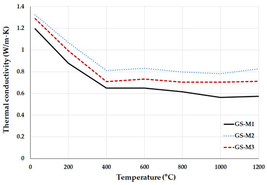 The thermal conductivity of geopolymer composites with different types of aluminosilicates as a function of the increasing exposure temperature is shown in Figure 8. Increasing the exposure temperature caused a significant decrease in thermal conductivity up to a temperature of 400 °C (from 1.2–1.3 to 0.8–0.65 W/m*K). The thermal conductivity of geopolymer composites decreases due to evaporation of free and chemically bound water from the pores of samples [58]. After the evaporation of water (from 400 °C), there was no notable decrease in the thermal conductivity of the examined samples. The thermal conductivity values obtained by other authors for the metakaolin-based geopolymer binders are 0.3–0.7 W/m*K [28,59]. The thermal conductivity of chamotte is around 1 W/m*K [60]. The results of thermal conductivity of geopolymer composites filled with chamotte were due to a combination of thermal conductivity of the geopolymer binder and filler. Geopolymer composites prepared from calcined kaolinitic claystones (GS-M2 and GS-M3) had a slightly higher thermal conductivity than the composite prepared from metakaolin (GS-M1).