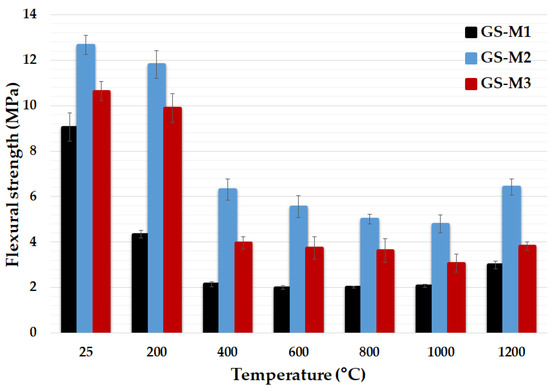 Figure 9 provides the results of flexural strength of geopolymer composites with different types of aluminosilicates tested at laboratory temperature and after heat treatment up to 1200 °C. All the tested samples of geopolymer composites had a decrease in flexural strength with increasing temperature up to a temperature of 1000 °C. The residual flexural strengths of GS-M1, GS-M2 and GS-M3 were about 24%, 50% and 37% at 400 °C, and for the unheated samples, the flexural strengths were 9.1, 12.7 and 10.6 MPa, respectively. The dehydration of the tested samples, which caused the formation of cracks, was the main reason for the significant decrease in flexural strength between the laboratory temperature and 400 °C [27,58]. The flexural strength of all samples increased at a temperature of 1200 °C. The flexural strengths of GS-M1, GS-M2 and GS-M3 were about 45%, 34% and 25% higher than their flexural strengths as tested at 1000 °C (2.1, 4.8 and 3.1 MPa). The crystallization of new phases (leucite and kalsilite) or sintering of the matrix could be the main reasons for the increase in flexural strength. The effect of aluminosilicate on flexural strength is evident; samples prepared from calcined kaolinitic claystones had better flexural strengths compared to samples from calcined kaolin. The highest flexural strengths at all temperatures were achieved in sample GS-M2 (25 °C–12.7 MPa; 400 °C–6.3 MPa; 1200 °C–6.4 MPa), followed by sample GS-M3 (25 °C–10.6 MPa; 400 °C–3.96 MPa; 1200 °C–3.8 MPa) and GS-M1 (25 °C–9.0 MPa; 400 °C–2.15 MPa; 1200 °C–3.0 MPa). Amin et al. [61] observed similar results of flexural strength (around 9.0 MPa) for metakaolinite-based geopolymer. These findings are in agreement with the findings from previous studies, which reported that the flexural strength of metakaolinite-based geopolymer decreases with elevated temperature [20,62].