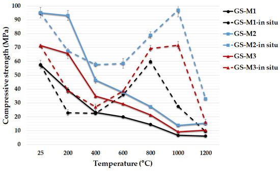 The described experiment was also aimed at investigating the compressive strength of geopolymer composites at high temperature tested in situ. Figure 10 shows that the dependences of the compressive strength on temperature, tested in situ, did not match the above-described dependences of the sample tested after heat exposure and cooling. The previously described dehydration also caused a decrease in the compressive strength of the investigated geopolymer composites in situ, up to a temperature of 400 °C. The change occurred from a temperature of 600 °C, when the compressive strength of all examined samples increased up to a temperature of 1000 °C (800 °C, in the case of GS-M1). The increase in compressive strength after exposure to temperatures higher than 400 °C can be attributed to the absence of a shrinkage phase during cooling or to increasing the plasticity of the tested samples [46]. There was a severe loss of compressive strength after exposure to 1200 °C (1000 °C), which can probably be attributed to the above-mentioned crystallization of new phases (leucite and kalsilite) or sintering. The same phenomenon was observed in the testing of in situ, high-temperature compressive strength, as in the case of compressive or flexural strength; samples GS-M2 (97.1 MPa at 1000 °C) and GS-M3 (71.9 at 1000 °C) had higher values of compressive strength than sample GS-M1 (29.1 MPa at 1000 °C). Higher values of mechanical strength can probably be attributed to particle morphology of aluminosilicate particles, which resulted in a higher solubility of calcined kaolinitic claystones and a subsequent faster geopolymerization process (calcined kaolinitic claystones had earlier initial setting time).