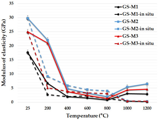 The effect of the three types of aluminosilicates on the results of modulus of elasticity of the prepared geopolymer composites, before and after exposure to elevated temperatures and in situ temperatures in the range of 200 °C to 1200 °C, can be seen in Figure 11. A substantial loss of modulus of elasticity with higher temperature, especially in the temperature range of 25 °C to 400 °C, and higher values of modulus of elasticity for samples prepared from calcined kaolinitic claystones (M2 and M3) compared to metakaolin (M1) were observed. The trends of the curves correspond with the results of compressive strength. Geopolymer composites GS-M1, GS-M2 and GS-M3 had a modulus of elasticity of 17.7, 29.9 and 25.1 GPa at laboratory temperature and 2.9, 6.5 and 4.6 GPa after exposure to 1200 °C. Amin et al. [61] produced a metakaolinite-based geopolymer composite with a modulus of elasticity around 30 GPa at laboratory temperature.