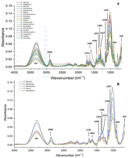FTIR spectra for obtaining cellulose crystalline indexes for the 25 Cactaceae species. (A) Non-fibrous species. (B) Fibrous species.