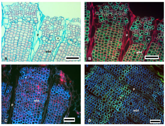 Finally, the difference in lignin tones was visible in SF and CA, such as v, whose intensity and fluorescence tonalities were different from wbt; while for AO, the tonalities were similar in v and wbt. For the distribution of cellulose in the non-lignified parenchyma and in the vascular tissue, SF was clearly observed in red tones; while in AO and CA, the fluorescence emission of the parenchyma was obscured by the fluorescence of the vascular tissue. Therefore, SF was an efficient method for determining the distribution of lignified tissues and cellulose, as was previously reported in the literature [21,22].