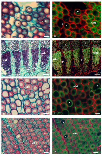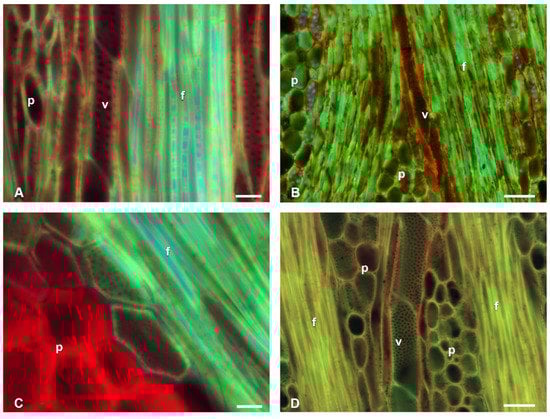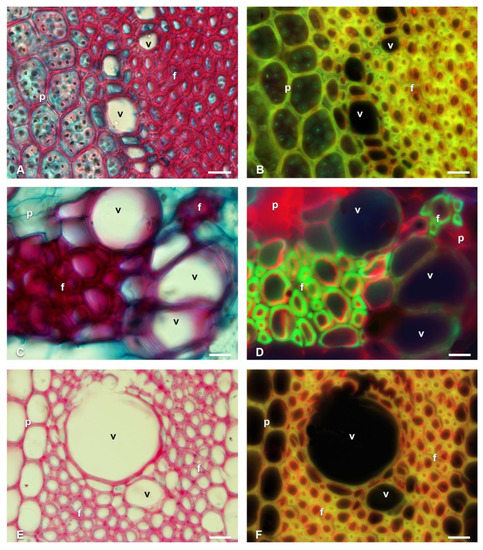 When comparing the bright-field images with the fluorescence images, it was observed that in the bright-field images, the blue tones corresponded to the non-lignified tissue, while the red tones corresponded to the lignified tissue. In the fluorescence images, the green tones reflected the lignified tissue and the red the non-lignified (Figure 2A,B). In the SF, AO, and CA stains (Figure 2) it was observed that the secondary walls of the vessel elements (v) and wide-band tracheids (wbt) showed fluorescence emission in green to bluish tones in all three types of staining. In non-lignified tissues, such as the parenchyma or the primary walls of the vascular tissue, in the SF and AO stains, the cellulose fluoresced in red tones, while, for CA, the tones were bluish to greenish (Figure 2D).