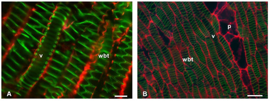 In non-fibrous species (Figure 5), cellulose fluorescence emission was detected in the primary wall of p, wbt, and v; unlike in fibrous species, where fluorescence emission was not detected in the primary wall but in the S3 layer of the secondary wall adjacent to the lumen. Furthermore, the non-fibrous species showed secondary walls as helical and annular thickenings in v and wbt, so the primary wall was visible in the longitudinal sections (Figure 6). In all non-fibrous species, the p was abundant and unlignified, in addition to having a greater accumulation of cellulose (Figure 5B,D,F,H and Figure 6B).