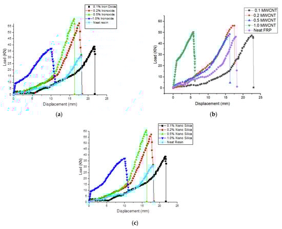 Load-displacement graphs of tensile tests for modified GFRP with (a) NFe, (b) MWCNTs, and (c) NS.