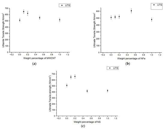 Figure 3 represents the load-displacement graphs under tensile loading of the neat glass-fiber-reinforced polymer (GFRP) and fiber-reinforced polymer nanocomposite GFRP with the different nanoparticles (NFe, MWCNT, NS) under different weight concentrations. From Figure 3a, it is observed that the breaking point of the fiber-reinforced nanocomposite with NFe as the filler under tensile load was earlier than that of the neat GFRP, except for the 0.1 wt% NFe sample, and this is because of the increase in the brittleness of the composite materials. The area under the curve of load-displacement is an indication of the modulus of toughness, which was calculated for all samples, and it was observed that the sample with 0.1 wt% NFe was 84.6% higher when compared to the neat GFRP. Whereas, for the other sample, this value is reduced to 29.4% when compared with the neat GFRP. It can also be observed that, as the weight percentage increased, the breaking point decreased. However, for the 0.1 wt% nano-iron oxide particles, there was an extended breaking point, and there was an increase in toughness of 84.6%, which was calculated as the area under the curve. There was a reduction in toughness of 29.4% for the 0.5 wt% nano-iron oxide fiber-reinforced polymer nanocomposite sample. Regarding the breaking point of the samples, in Figure 3b, it is observed that it is the same for all samples except for the 0.1 wt% MWCNT sample. The toughness improved by 14.6%, 30.82%, 52.66%, and 78.06% for the 0.1, 0.2, 0.5, and 1.0 wt% samples, respectively. Figure 3c shows that the breaking point extended by 20% for the 0.1 wt% nano-silica fiber-reinforced polymer nanocomposite sample, and thereafter it decreased for the rest of the samples. Breaking occurred 40% earlier when compared to the neat GFRP composite material. There were improvements in toughness of 43%, 83%, 63%, and 38.1% for the 0.1, 0.2, 0.5, and 1.0 wt% samples, respectively, of the fiber-reinforced polymer nanocomposites with nano-silica as the filler. From these graphs, the tensile strengths of the specimens were obtained, and they are compiled in Figure 4a–c. The common behavior of an increase in ultimate tensile strength for the 0.1 wt% sample was observed in all the modified GFRPs. In the case of the sample modified with MWCNTs, a slight decrement in ultimate tensile strength was observed for the 0.2 wt% sample, and thereafter it remained constant. For the sample of 0.1 wt%, a tensile strength improvement of 30% overall was seen. In the case of the samples modified with nano-iron oxide particles, the maximum tensile strength of the 0.2 wt% sample exhibited an increment of 20% when compared with the neat GFRP. For the third set of samples modified with nano-silica, the maximum tensile strength for the 0.5 wt% sample exhibited an increment of 35% when compared with the normal GFRP. The good dispersion and exfoliation of the nanoparticles are the reasons for this improvement in tensile strength. The presence of an agglomerate caused a drop in the tensile strength of the specimens with a higher wt% of nanoparticles. This causes stress concentration rather than load transfer, and failure starts at this point.