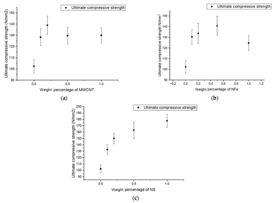 Variation in ultimate compressive strength of modified GFRP samples with different weight percentages of (a) MWCNTs, (b) NFe, and (c) NS.