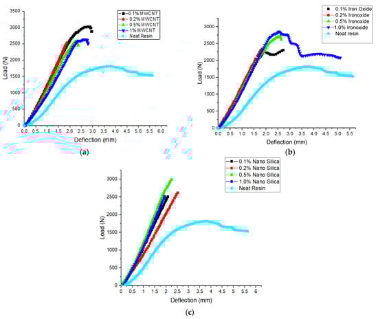 Load vs. deflection graphs of bending tests for modified GFRP with (a) MWCNTs, (b) NFe, and (c) NS.