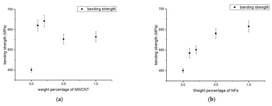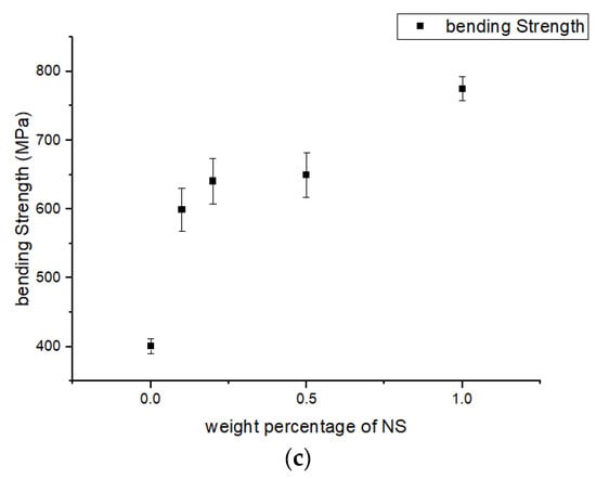 Zheng et al. [24] carried out a similar study in which NS was used to modify epoxy resin, and this modified resin was used as a matrix system in composites with glass fiber as reinforcement. Three different weight percentages of NS—1%, 5%, and 7%—were used for the preparation of the different laminates. Under tensile loading, the tensile strength and the tensile modulus improved by 24% and 22%, respectively, and a relatively smaller improvement was reported for the compressive and shear strengths, which improved by 13% and 14%, respectively. Under bending, the strength also increased by 22%. The reason for this improvement was given as a strong covalent bond between nano-silica and the fiber surface, which led to a better transfer of load and stress from the fiber to the matrix, and vice versa. As the weight percentage of nano-silica was high, the uniform dispersion of NS in the resin was not possible, thereby the compressive and shear properties did not improve to that extent.