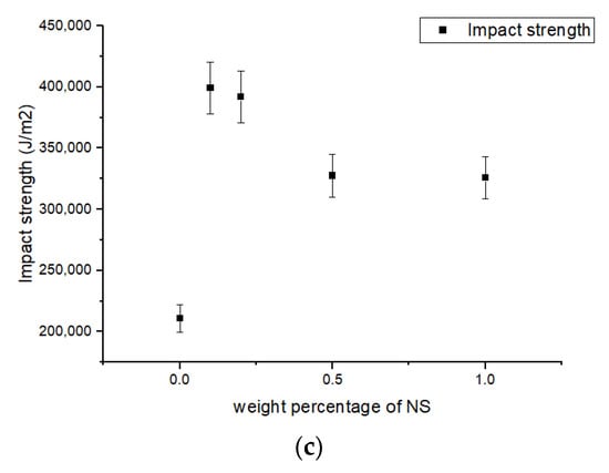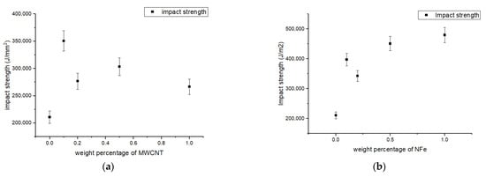 As discussed in Section 3, the Izod impact test was executed, and the impact strength of the samples with diverse nanoparticles such as MWCNTs, NFe, and NS can be seen in Figure 8a–c. For the MWCNT set of samples: (i) the 0.1 wt% sample had the highest impact strength; and (ii) for the 1.0 wt% sample, the rise in impact strength was 66%, and the minimum rise was 26%. The impact strength of the nano-iron oxide sample increased by 127% for the 0.5 wt% sample, reached a maximum of 89% for the 0.1% sample, and reached a minimum of 54% for the 1.0 wt% sample in the case of the samples with nano-silica particles. The escalation in impact strength of the aforesaid lamina is a consequence of morphological modification in the resin during crystallization. The impact strength reduced and remained constant thereafter for the 0.2 wt% sample in the case of the samples with MWCNTs and nano-silica compared to the nano-iron oxide samples because of the agglomeration of these particles in the resin base.
