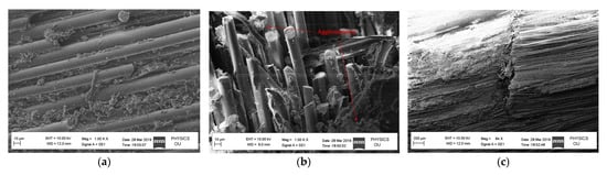 An SEM analysis of the fractured surface of a specimen subjected to tensile and flexural loading was conducted. Figure 9a shows an SEM image of the modified GFRP sample with 0.5 wt% nano-silica, where a fiber pullout phenomenon is not observed and the fibers are broken. This suggests that the presence of nano-silica in the FRP caused an increase in friction for the fibers to come out. Figure 9b shows an agglomeration of nanoparticles, which led to a reduction in tensile strength in the case of the 0.5 wt% MWCNT sample. For the bending-test sample, a rough surface is observed on the fractured area as shown in Figure 9c. This indicates delamination and fiber splitting.