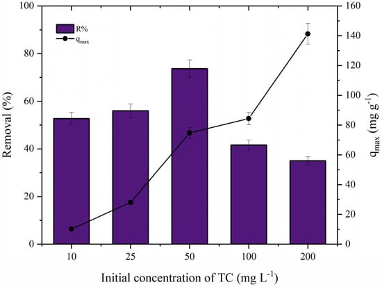 3.6.2. Effect of Initial Concentration of TC and Adsorbent Dosage