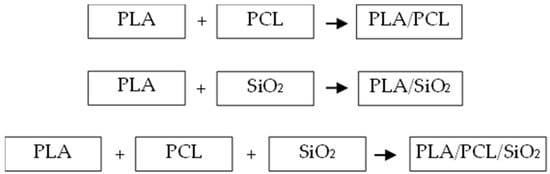 In this research, PLA is used as the main component of the matrix for the preparation of blends with PCL, because the studies published on this topic have shown that the mixture of PLA and PCL can reduce the stiffness of the prepared blends and improve the toughness [,,,,]. Since PLA and PCL are relatively immiscible polymers [,,], nanoscale silica was added to PLA/PCL blends to increase their miscibility and thus optimize the properties of the resulting blends. Nanoscale silica has been used in different studies as a filler for improving the miscibility and mechanical and thermal properties of PLA and PCL blends [,,,,].