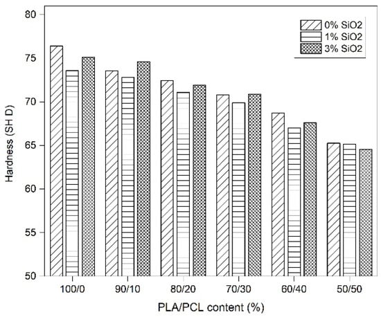 The mechanical properties of the blends were measured to determine the influence of the nano-silica filler on the neat PLA and the PLA/PCL blends. The results of the hardness test are shown in Figure 4. It can be seen that the addition of PCL to PLA causes a decrease in hardness in the observed blends. These results were expected due to the fact that blending of PCL into the PLA matrix can improve the toughness of PLA/PCL, which is consistent with the previously published research results [,,,,]. The measured hardness of neat PLA is 76.42 SH D. The addition of PCL to the PLA continuously decreases the hardness value to 65.25 SH D for the blend PCL/PLA 50/50.