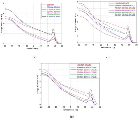 Storage modulus of blends: (a) PLA/PCL; (b) PLA/PCL and 1 %wt SiO2 and (c) PLA/PCL and 3 %wt SiO2.