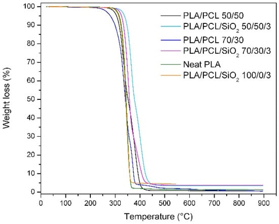 Thermogravimetric analysis (TGA) was carried out in order to observe the thermal stability and thermal degradation of observed blends using a TA Instruments Q500 (New Castle, DE, USA). The change in mass of samples was measured during controlled temperature change and under defined atmosphere conditions. Approximately 10 mg of PLA/PCL blends with and without addition of nano-silica were heated from 25 °C to 900 °C in an inert nitrogen atmosphere with a flow rate of 60 cm3/min.
