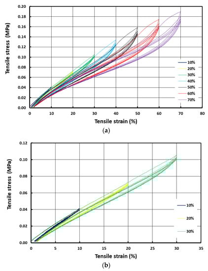 - Mai, T.-T.; Morishita, Y.; Urayama, K. Induced anisotropy by Mullins effect in filled elastomers subjected to stretching with various geometries. Polymer 2017, 126, 29–39. [Google Scholar] [CrossRef]