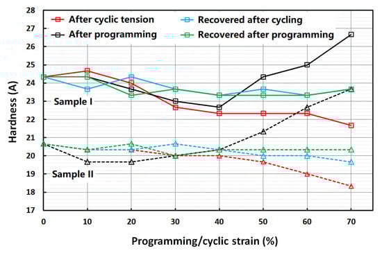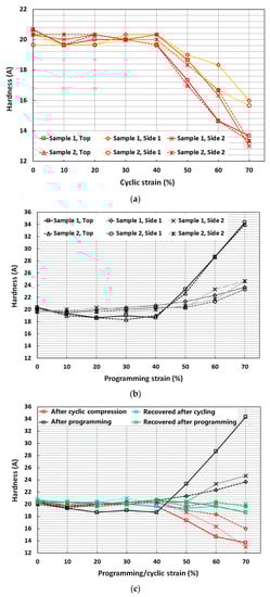 Evolution of Shore Hardness under Uniaxial Tension/Compression in Body-Temperature Programmable Elastic Shape Memory Hybrids