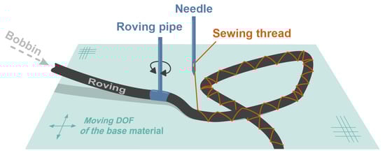 Recently, the demand for energy-efficient systems has leveraged the use of fiber-reinforced plastics (FRP) lightweight composites in structural components [1,2]. These materials are increasingly being employed in aeronautical, aerospace, and automotive applications. By employing a variable-axial (VA) fiber design, stiffness and strength properties may be improved when compared to classical FRP designs [3,4,5,6]. Thereby, the term VA means varying the fiber orientation at the ply level. The desired performance of FRP composites is achieved by guiding the loads almost exclusively along the fiber orientation and thus minimizing the shear load of the matrix. For a technical realization, TFP technology, which was developed at Leibniz-Institut für Polymerforschung Dresden (Germany), is well suited. The basics and some applications of TFP technology are described in [7,8]. Generally, the placement of carbon fibers is usually carried out by stitching dry rovings, as shown in Figure 1. The roving is guided through a rotatable roving pipe onto a base material, where a sewing thread applied in the zig-zag pattern holds it in place [3].