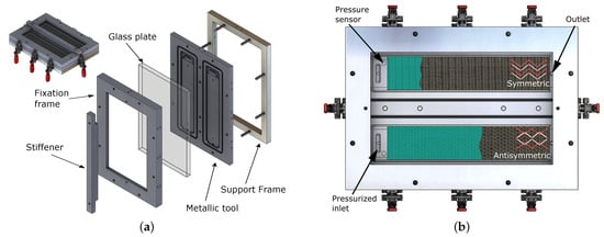 In order to evaluate the infusion and the permeability of TFP preforms, a special RTM tool was manufactured, and its main characteristics are shown in Figure 2. It consists of a metallic frame on which the cavity forming plate is positioned and covered by a glass plate, enabling the resin flow front to be tracked optically (see Figure 2a), similar to the approaches of [14,19]. To prevent the glass plate from bending due to the pressure, a stiffener is added on top of the glass plate. A quick-release clamping system is used for the handy opening and closing of the tool (see the red handlers in Figure 2 and Figure 3). The setup of Figure 2a enables different studies of infiltration by only changing the cavity plate (metallic tool). In this case, two rectangular cavities—350 × 75 × 1 (mm)—were used to perform two infusion tests simultaneously. The preforms are positioned inside these cavities with the aid of silicon profiles at their edges to prevent race-tracking. Furthermore, each cavity also has an o-ring to ensure the sealing. A pressurized resin reservoir is used to inject the resin into the cavities without the assistance of vacuum at the outlet (see Figure 2b). A pressure of 1 to 3 bar above atmospheric pressure is kept in the reservoir. Moreover, pressure sensors are used near the inlet to measure the pressure inside the cavity.