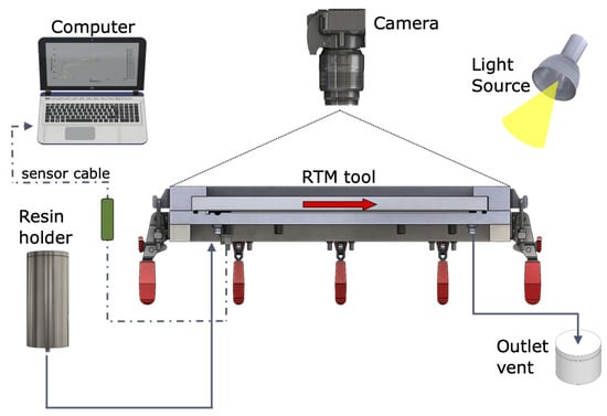 The resin flow tracking scheme is shown in Figure 3. At the RTM tool inlet, the pressurized resin holder is connected. On the opposite side, an outlet vent is attached. The solid red arrow shows the direction of the resin flow. The resin front assessment is made optically by a standard DSLR camera. Reference points engraved on the glass plate were used for optical distortion and perspective corrections. The acquisition times for each sensor were different: one photo every second and five assessed points on the pressure sensor. Moreover, these assessments were not synchronous.